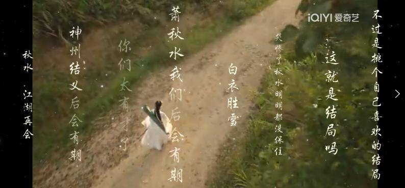 值得一提的是,在剧作的大结局,萧秋水一人一琴一剑一袭白衣留给江湖一个背影,弹幕也随即变成了毛笔字古风特效,整个画面宛如一幅古风画卷,很有意境。